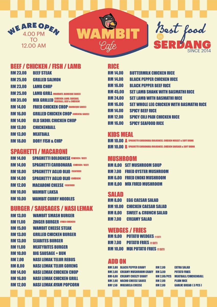 Welcome to WAMBIT, a charming café nestled at No 6, Jalan Kenanga 2, Taman Kenanga, Serdang. With its serene lakeside view and adjacent playground, it's a perfect spot for families and friends alike. The relaxed ambiance and ample seating allow you to enjoy your meal without the hustle and bustle.